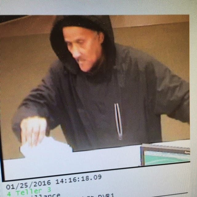 The suspect, according to the alert, was described by witnesses at the bank as a approximately 6-foot tall black male with light brown skin and some missing teeth. The suspect was wearing a dark grey or black hooded sweatshirt with a pocket on the left chest, that pocket has light grey or white trim. The suspect handed a note to the teller, but did not display a weapon at the time of the incident. An undisclosed amount of cash was taken in the robbery.