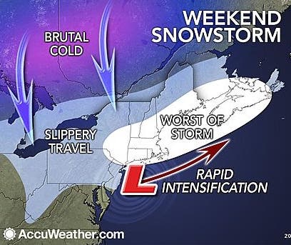“Snow, fierce wind, and bitterly cold air” is some of the weather being predicted by AccuWeather.com, noting that the storm will come in two phases – a weak system, at first, and then a second burst following through.