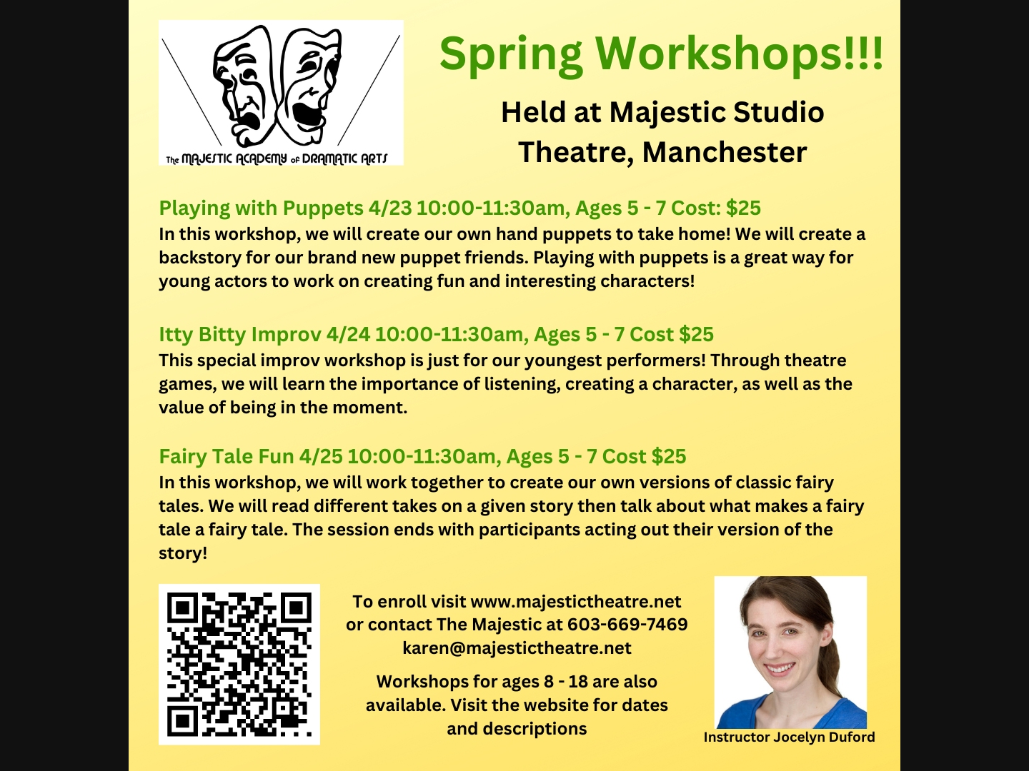 The Majestic Academy of Dramatic Arts will host workshops for children ages 5 – 7 YEARS ON April 23, 24 & 25. Workshops will be led by Jocelyn Duford and held at Majestic Studios in Manchester. Offerings include: