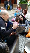 Carmita L’abbe, age 3, and her mom Jessica of Auburn, NH, listen to Officer Casey Seigle read aloud at The Mall of New Hampshire’s Kidgits Book Blast on Saturday, March 7.