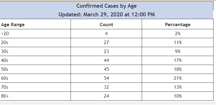 In Maine, there have been 253 positive tests and three deaths from the virus. Maine also releases ages by groupings. In Maine, 2 percent of the cases have been people younger than 20; 11 percent or 27 cases are people in their 20s; 23 cases or 9 percent are in their 30s.
