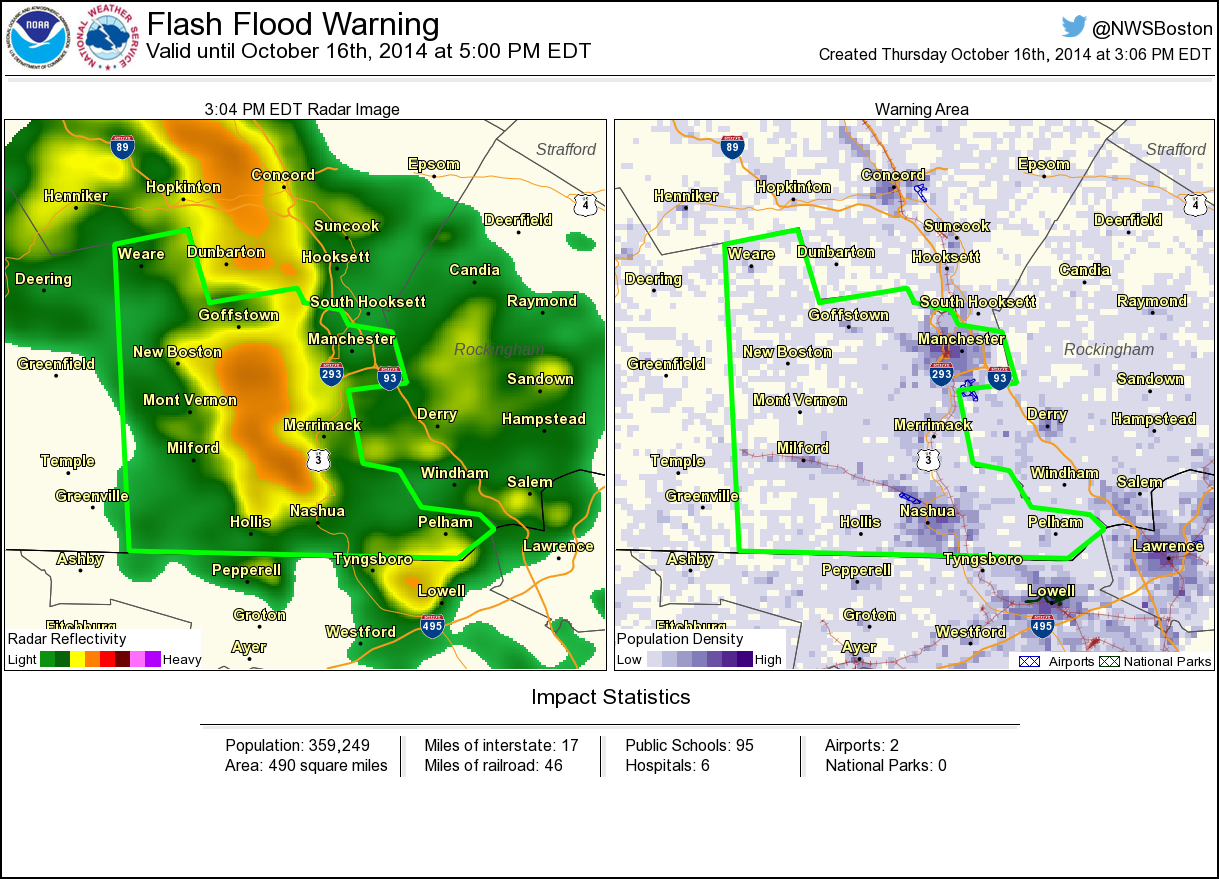 The National Weather Service has issued a flash flood watch for Merrimack, Hillsborough, and Rockingham counties through 2 a.m. on Friday, Oct. 17.