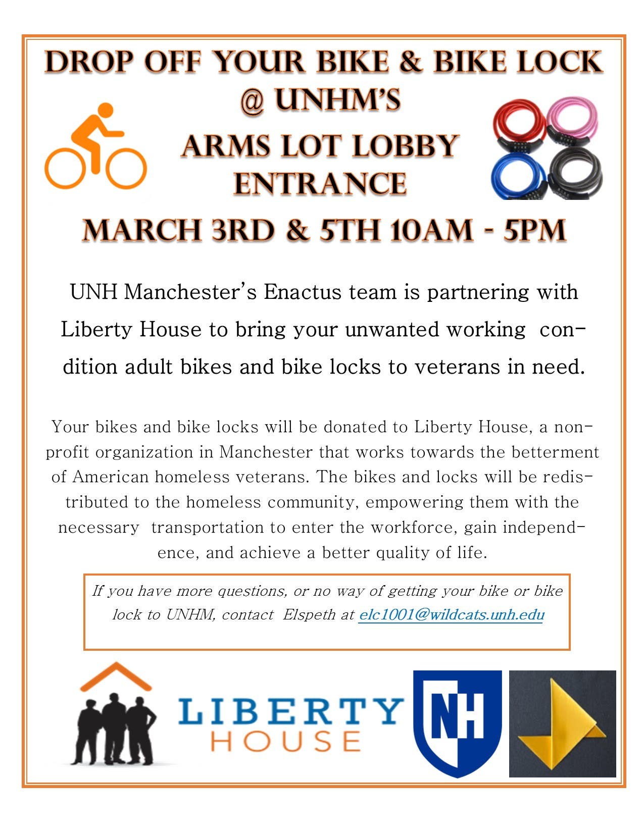 UNHMs Enactus team is partnering with Liberty House to bring your unwanted working condition adult bikes and bike locks to veterans in need