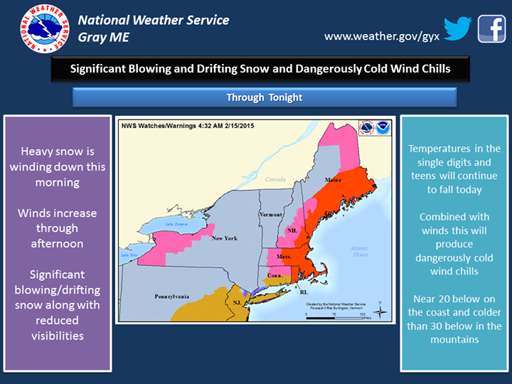 The National Weather Service has issued a wind chill warning until noon on Monday, Feb. 16, 2015.
