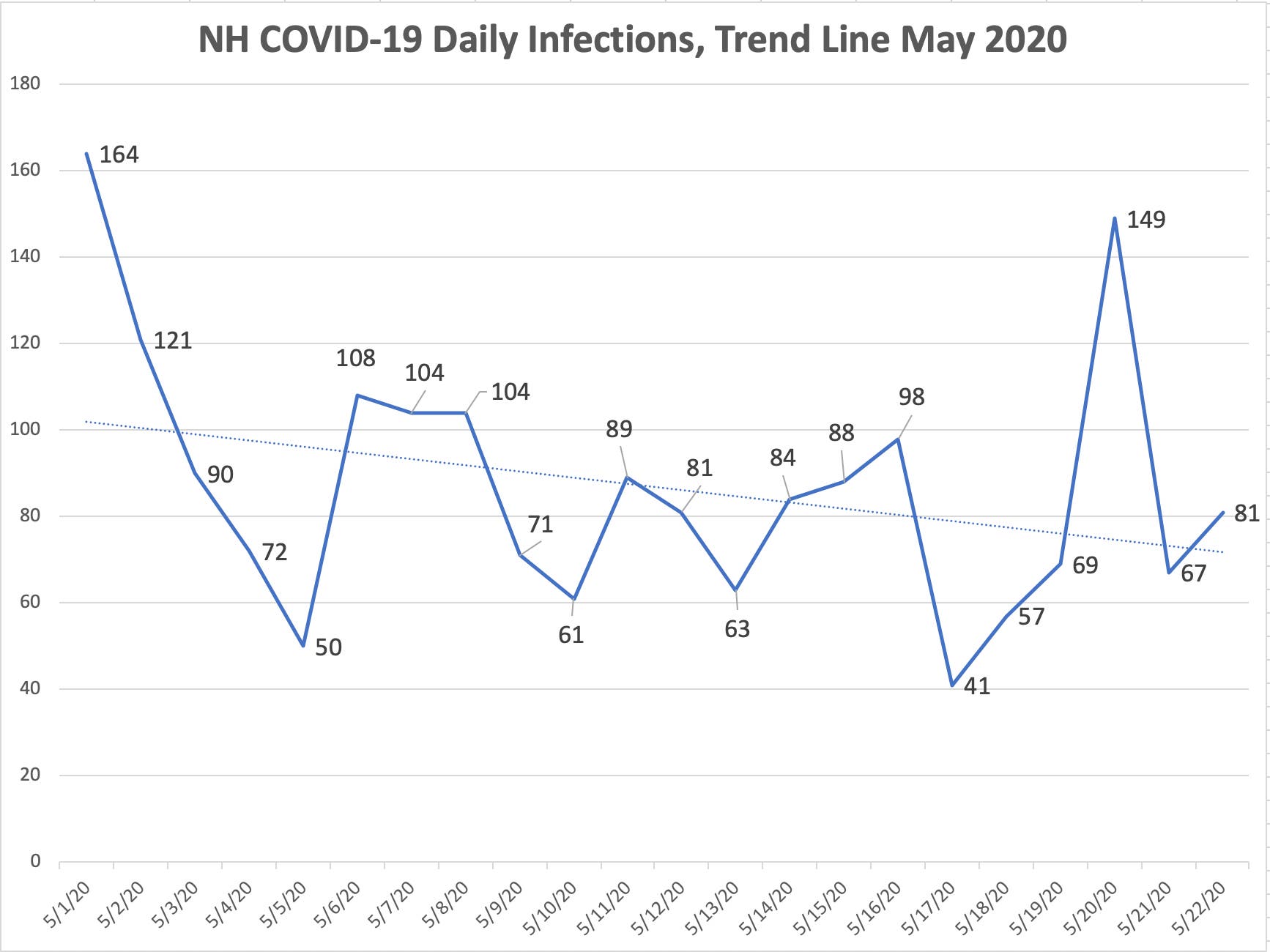 The daily positive test count from May 1 to May 22 and a trend line. Despite political statements on Twitter, cases aren't increasing in New Hampshire; they are fluctuating and trending down. Credit: Tony Schinella