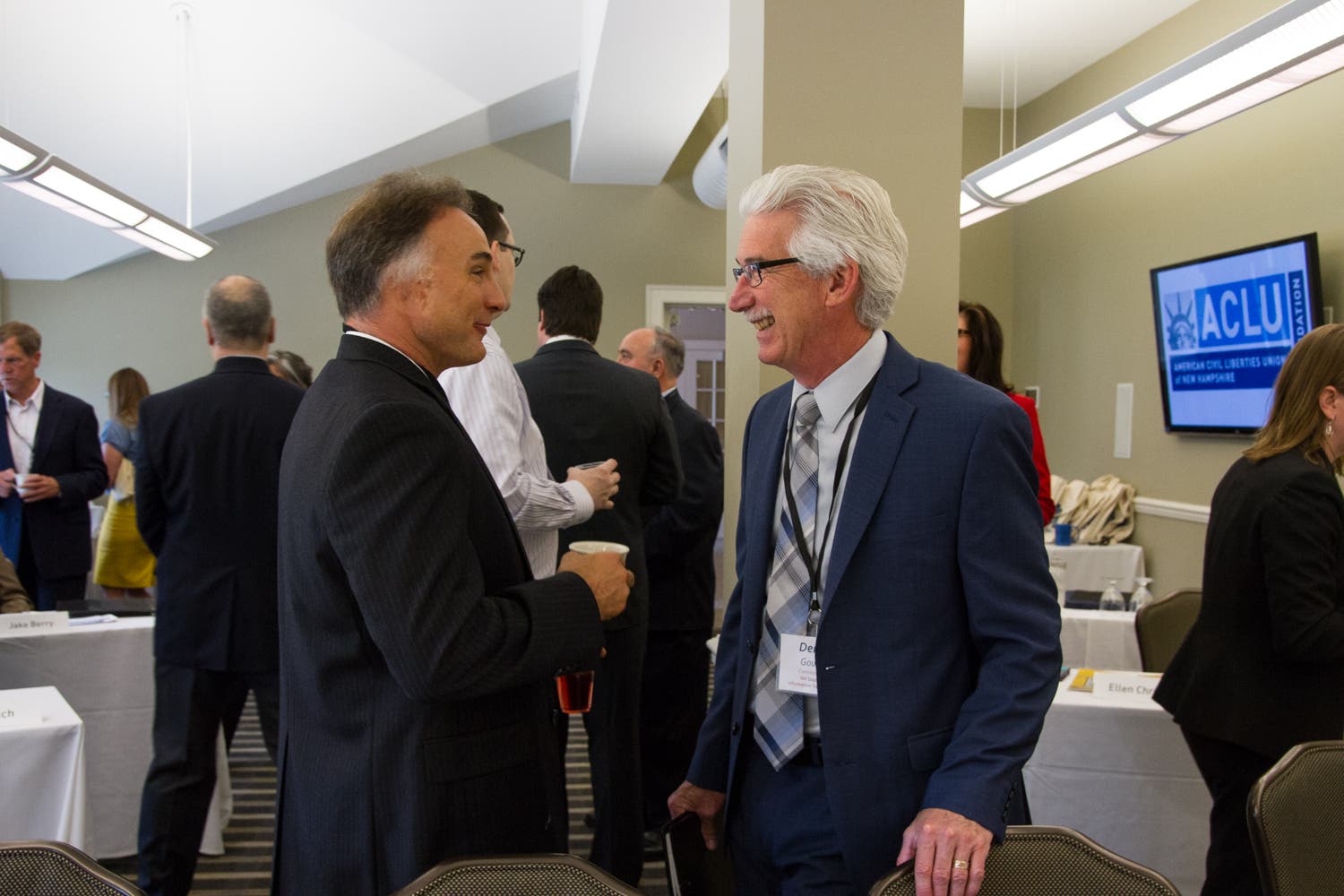 Caption: American Civil Liberties Union of New Hampshire (ACLU) May 13 meeting on Privacy & Technology in the Granite State. Left to Right: Arlo Bess of Hewlett Packard and Denis Goulet Commissioner, NH Dept. of Information Technology.