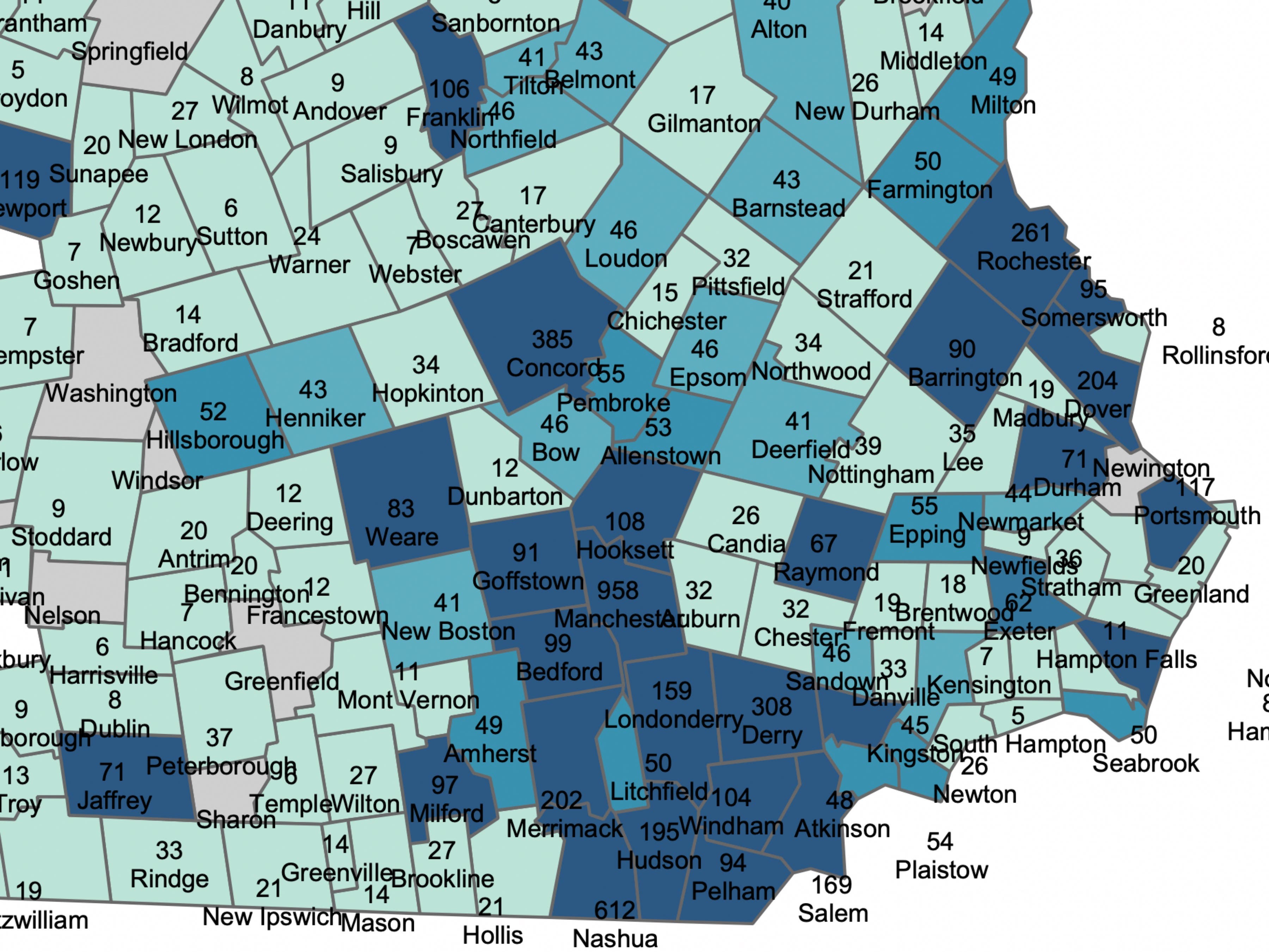 The latest active case count from communities in southern New Hampshire. Source: New Hampshire Department of Health and Human Services.