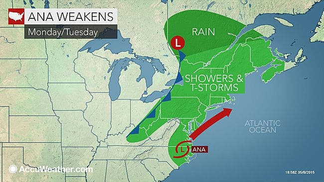 Accuweather.com is suggesting that the summerlike warmth will ease back into the region after Tropical Storm Ana brings rain showers and thunderstorms, which will be a welcome relief for a state already scorched by brushfires this month.