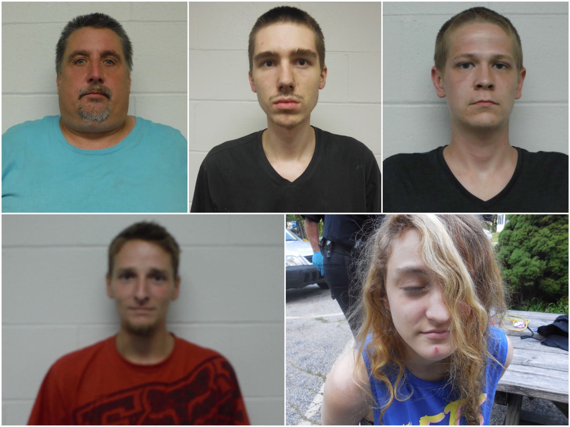 From left to right, starting at the top, police arrested Richard Rollins, 50, of Pembroke, on a possession of heroin (control of premises) charge for allegedly allowing drug activity in his residence; Clinton Rollins, 21, of Pembroke, was arrested on possession of heroin and breach of bail charges; Derek Paradise, 27, of Concord, was arrested for possession of heroin; Michael Bean, 30, of Manchester, was arrested on outstanding warrants out of Laconia and Pembroke; and Jacey Eaton, 21, of Concord, was also arrested on outstanding warrants out of Concord.