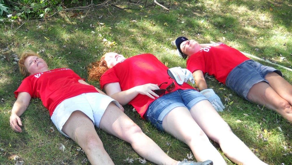Caption: Nancy Watson, Branch Supervisor of FSB’s Boscawen office, Michelle Swift, ATM/Debit Card Specialist, and Linda Congdon, Commercial Lending Assistant, take a much needed break after a day of clearing brush at Webster Place in Franklin during GUW’s Merrimack County Day of Caring event.