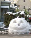 It was back into the time machine for Sunday morning, when was celebrating the 400th anniversary of the printing of the King James Bible by reading the lessons from that version and taking much of the Eucharist from the 1549 Book of Common Prayer, complete with Shakespearean grammar and those idyosincratick spellynges by whiche thou knowest thatte thou art outsyde of thisse thine own centurie. Snaking my way home along half-shoveled sidewalks where green leaves lay encased in slush ice, still brushing bits of bad pun out of my hair, I was hardly thrown off my stride by the five-foot diameter snow jack o’lantern on State Street. Yeah, another time warp. Whatever.