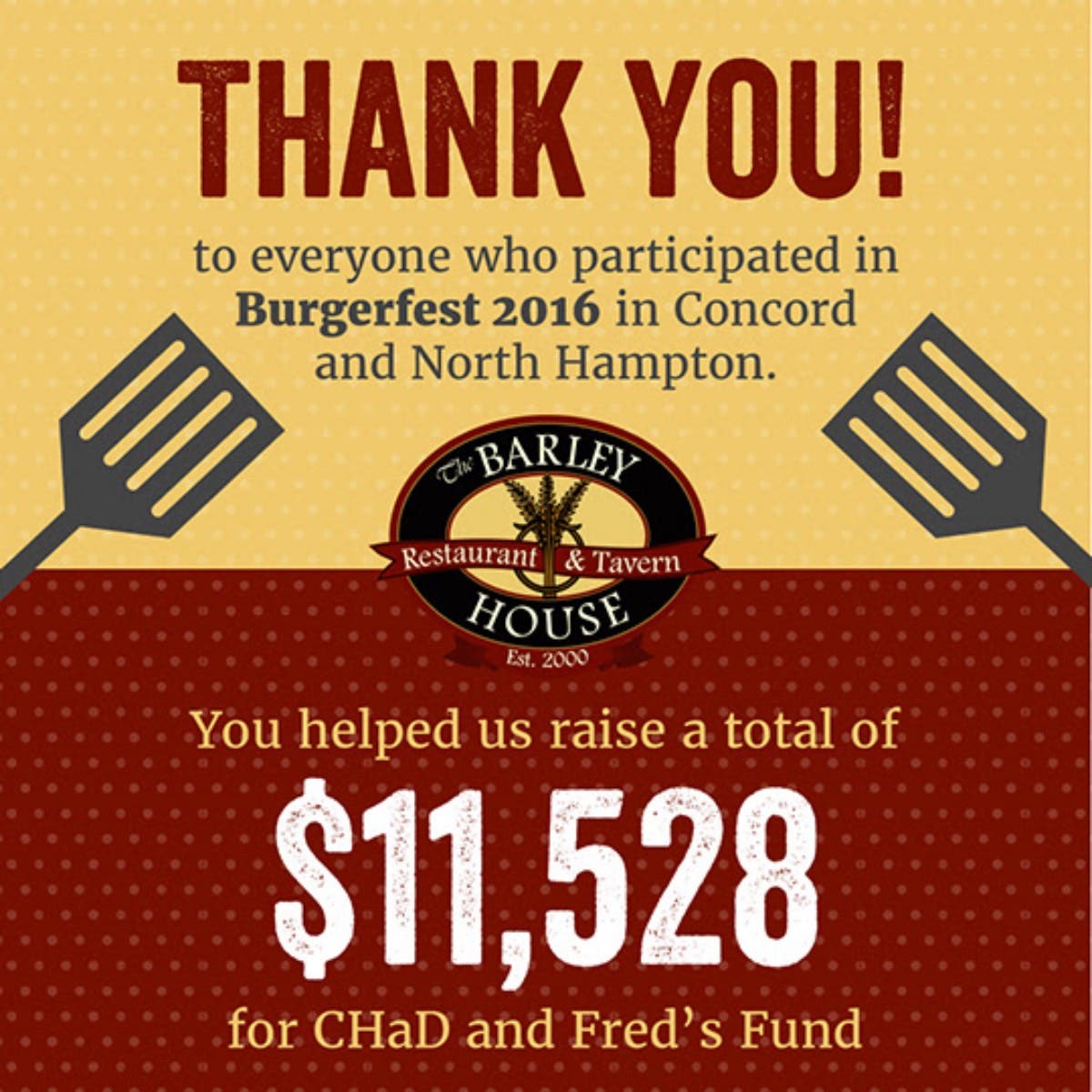 CONCORD, NH – The numbers are in and this year’s Burgerfest, held at The Barley House in both Concord and North Hampton, raised more than $11,000 – $11,528, to be exact – for Fred’s Fund at the Children’s Hospital at Dartmouth.