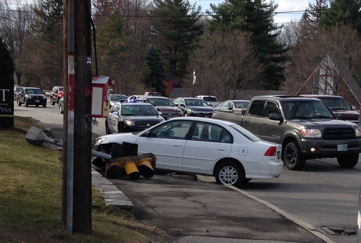 A Honda Civic sedan crashed into a traffic signal post at the intersection of North Main and Bouton streets and I-393 at around 4:30 p.m. on Friday, April 17, 2015.