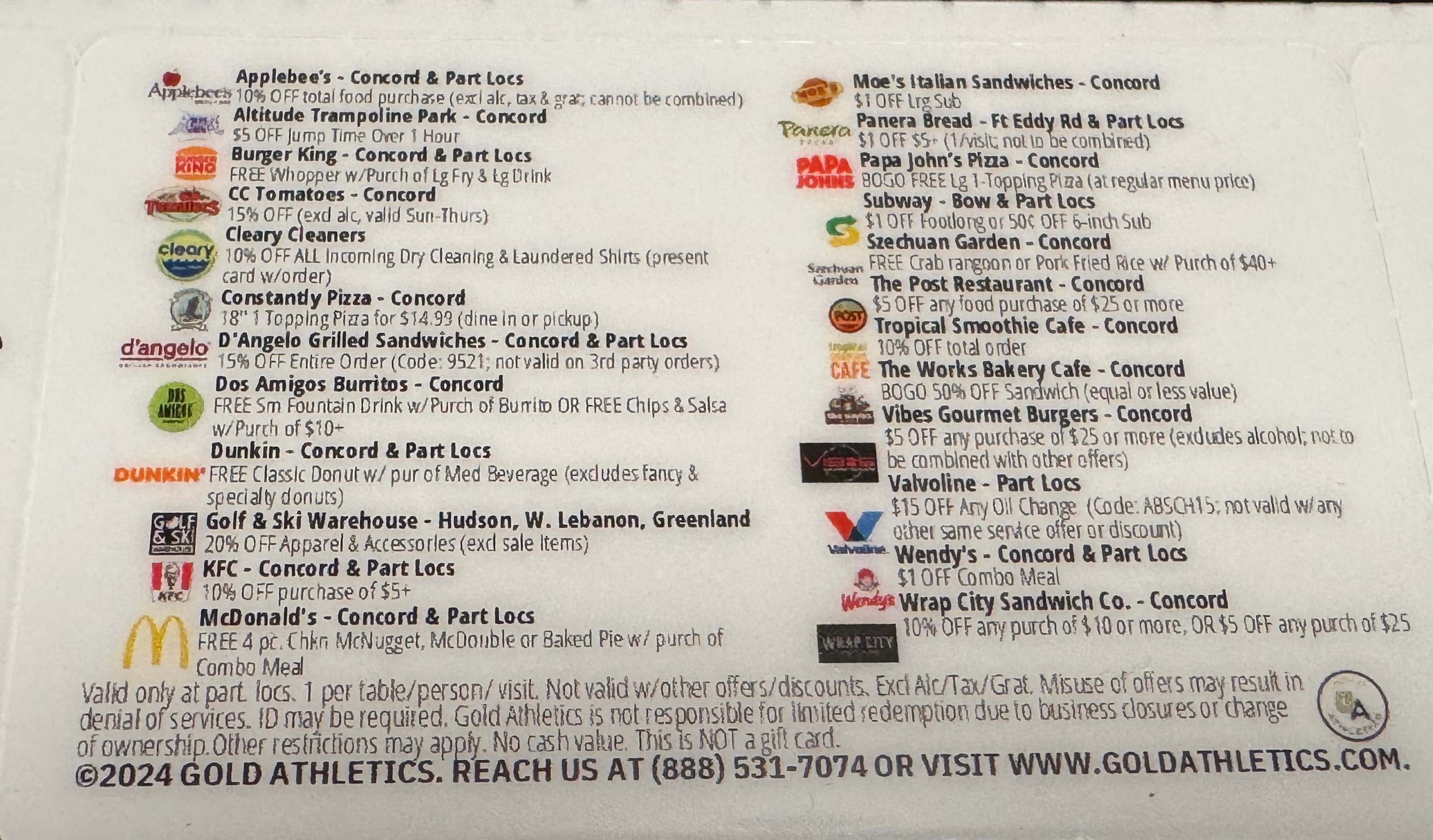 Businesses participating include 110 Grill, Applebee’s, Altitude Trampoline Park, Buffalo Wild Wings, Burger King, CC Tomatoes, Cleary Cleaners, Constantly Pizza, D’Angelo, Dos Amigos Burritos, Dunkin’, Golf & Ski Warehouse, KFC, McDonald’s, Moe’s Italian Sandwiches, Panera Bread, Pap John’s Pizza, Subway (in Bow and participating locations), Szechuan Garden, Tandy’s, TGI Fridays, The Post, Tropical Smoothie Café, The Works Bakery Café, Vibes Gourmet Burgers, Valvoline, Wendy’s, Weathervane Seafood Restaurant, and Wrap City Sandwich Company.