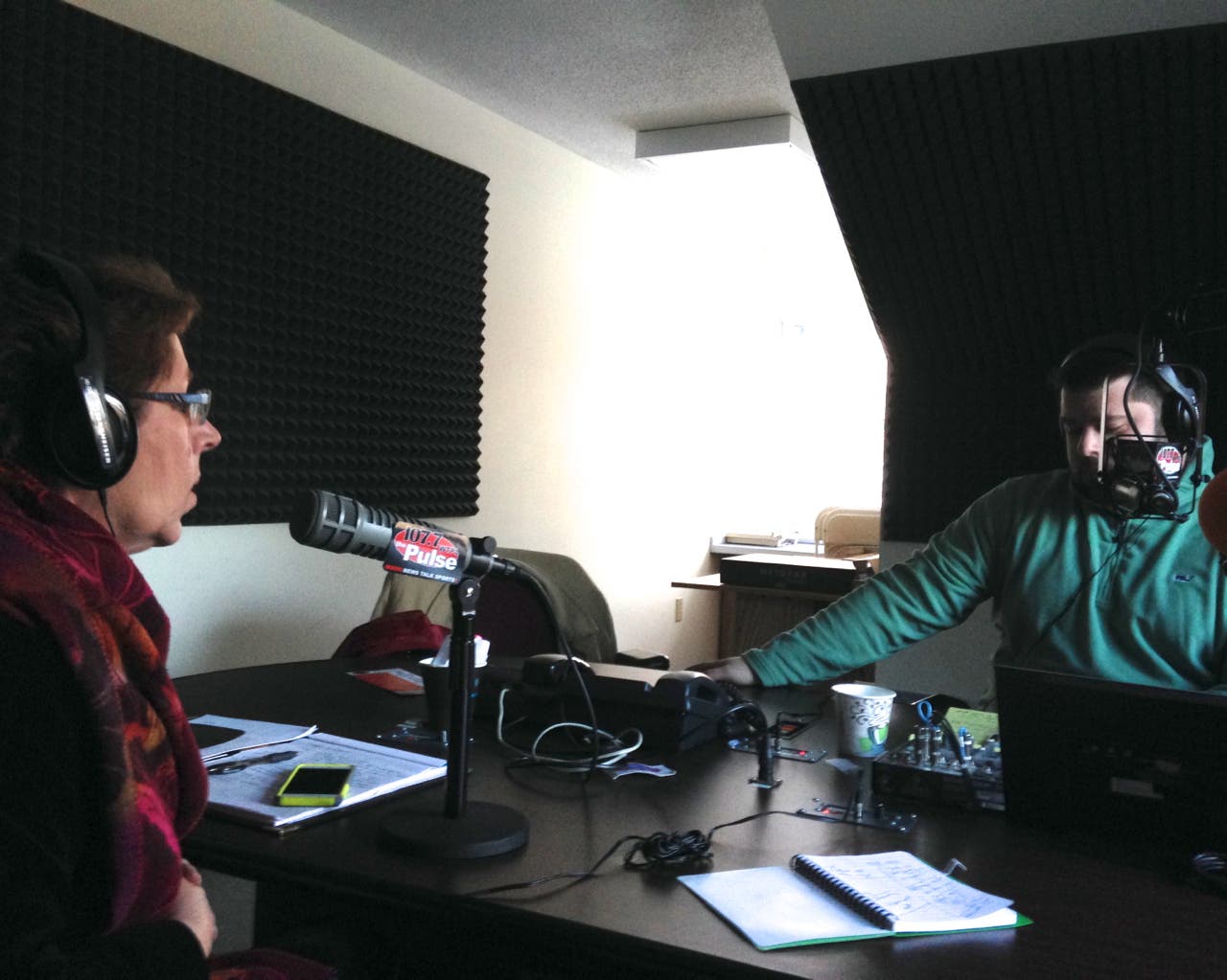 Caption: State Rep. Jackie Cilley, D-Barrington, speaks with former House Majority D.J. Bettencourt, R-Salem, about her minimum wage increase bill on WTPL-FM in Bow on Jan. 8.