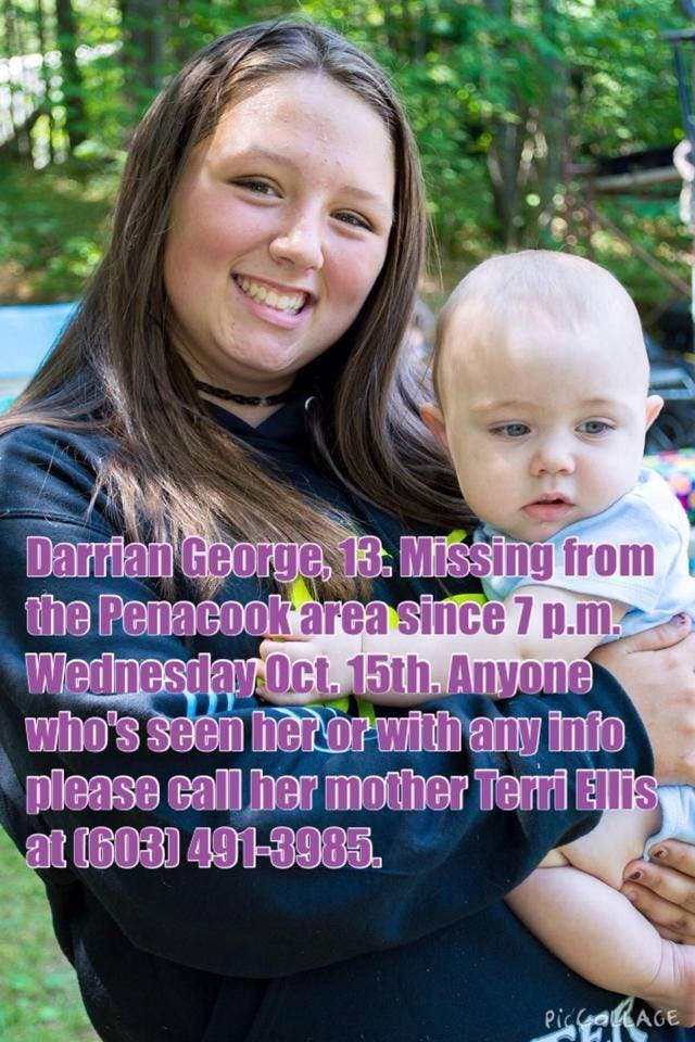 Loudon teen, Darrian George, has been missing since 6 p.m. last night; Facebook alerts claim she was abducted.