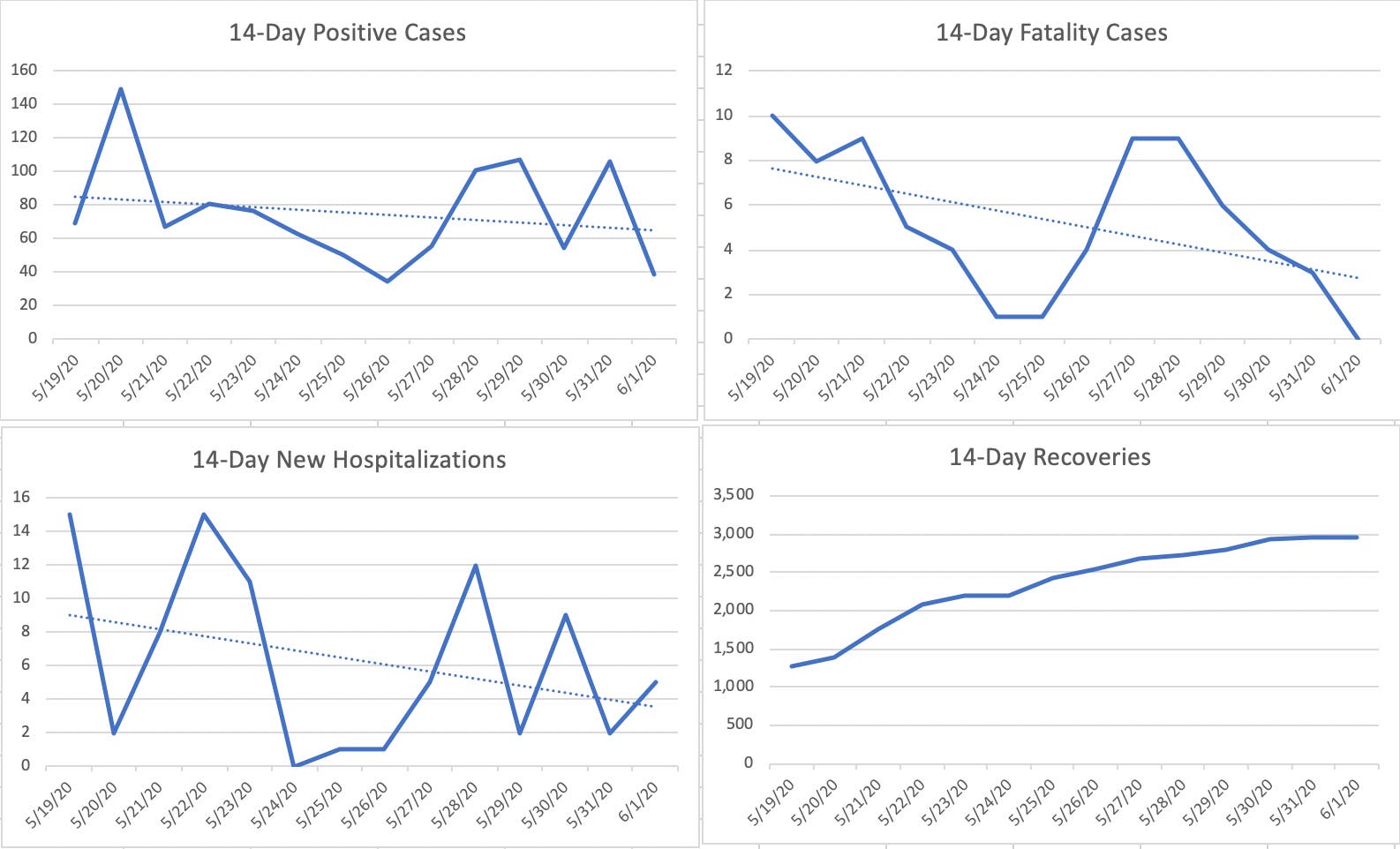 Two-week indicators of daily positive case counts, fatalities, and new hospitalizations, as well as 14-day recovery numbers. Credit: Tony Schinella
