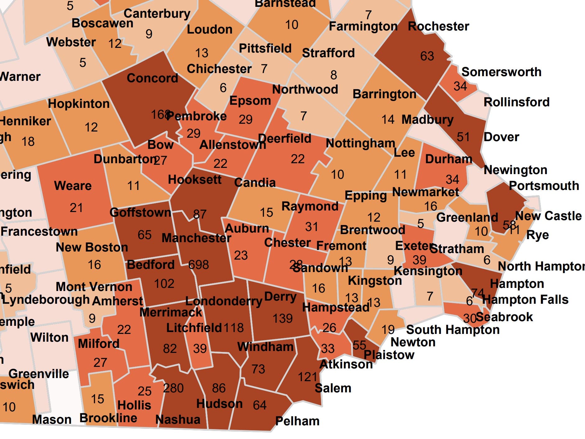 According to the state, 178 of the new infections live in Hillsborough County outside of Nashua, 162 live in Rockingham County, 94 live in Merrimack County, and 32 live in Nashua.