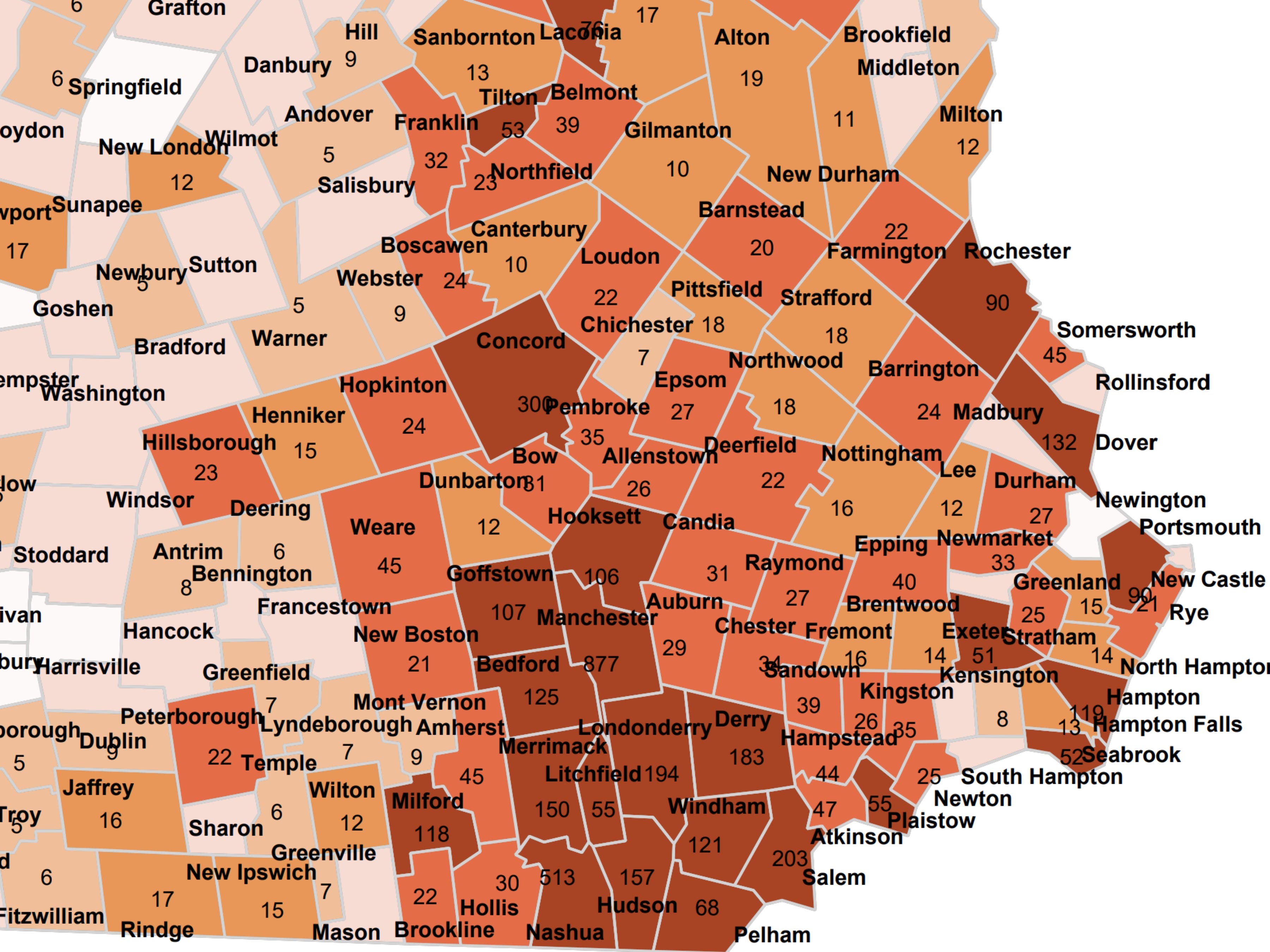 Of the new cases, 93 were children and the genders were equal at 50 percent each. The county of residency is still being determined for 35 new cases but the bulk of the new cases, 234, live in Rockingham County while another 209 reside in Hillsborough County outside of Nashua, 74 live in Merrimack County, and 59 live in Nashua.