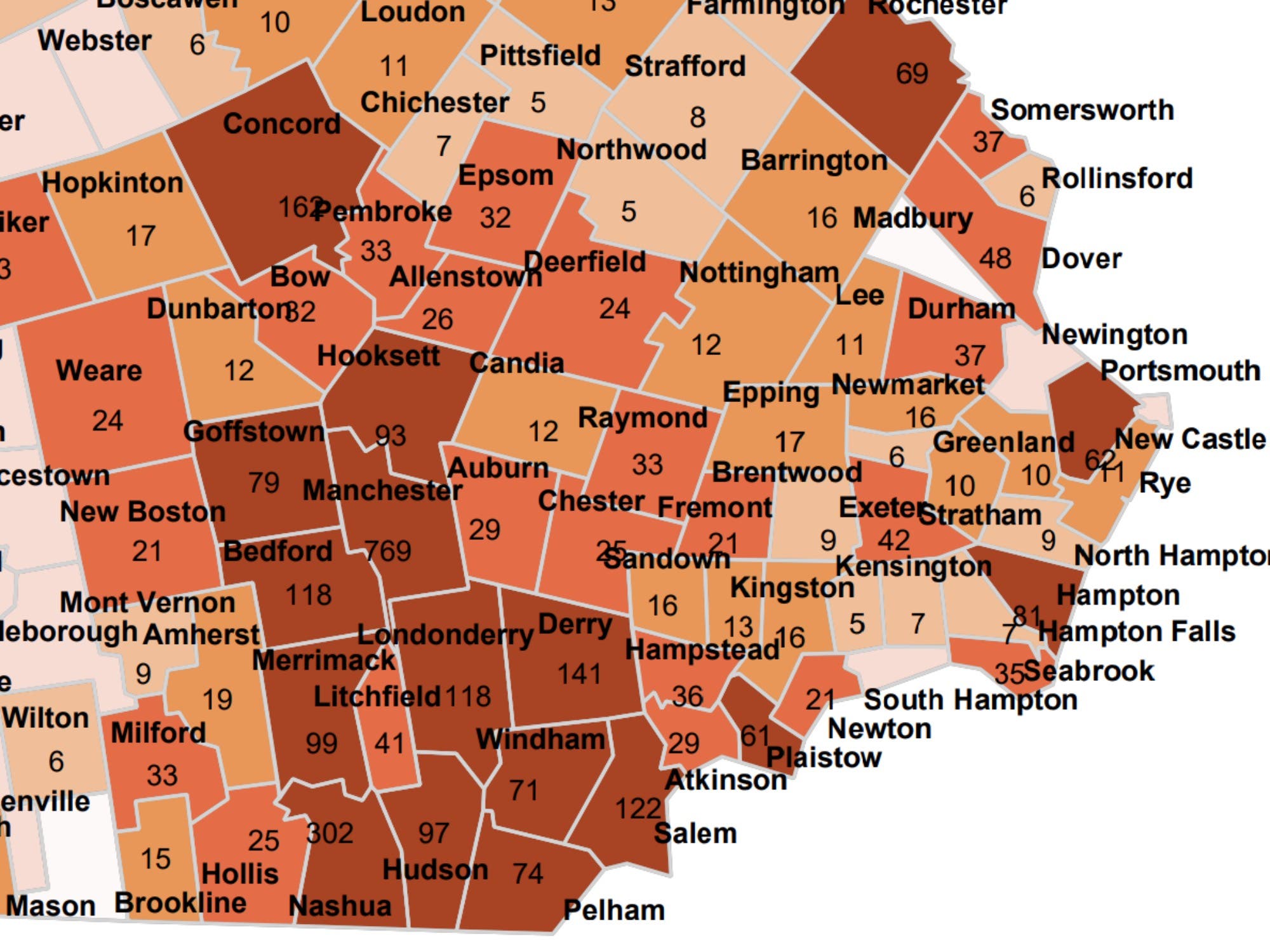 The latest current case map of southern New Hampshire. Source: NH DHHS.