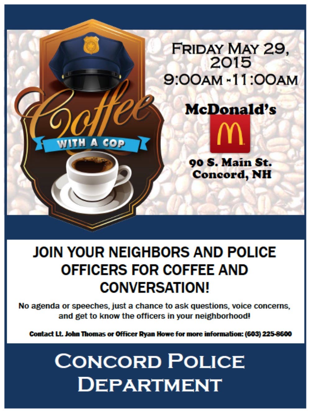 Coffee with a Cop provides a unique opportunity for community members to ask questions and learn more about the department’s work in Concord’s neighborhoods. All community members are invited to attend. The event is being held between 9 and 11 a.m. on May 29, at McDonalds, 90 S Main St. in Concord.
