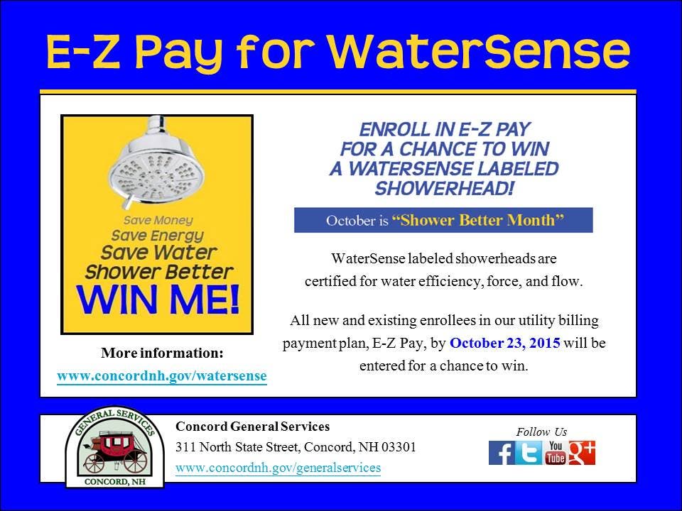 Shower better this October with WaterSense and enter in to Concord General Services’ E-Z Pay for WaterSense contest. Full official contest rules and more information are available at the Utility Billing Office and online at concordnh.gov/watersense.