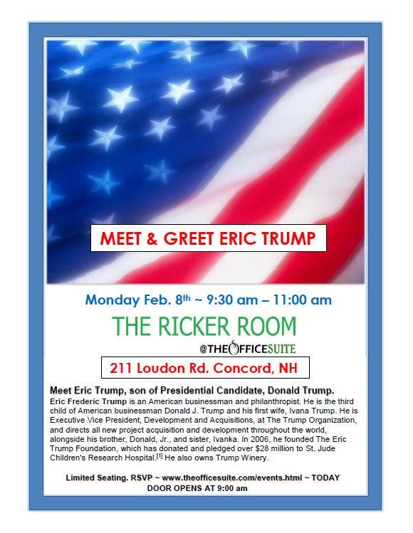 MEET & GREET with ERIC TRUMP Monday Feb. 8th 9:30 am ~ The Ricker Room @ The Office Suite 211 Loudon Road Concord, NH