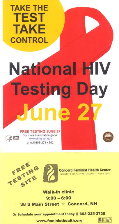 The Concord Feminist Health Center encourages you to come in Thursday, June 27th for a FREE and CONFIDENTIAL HIV test. Results are available in 20 minutes and it is a simply mouth swab. Health Counselors will be on hand to answer any questions you may have. In hopes of encouraging more people to get tested we are offering this service with the need to make an advance appointment. You are welcome to schedule a time by calling 225.2739 but you don't have to. We can also offer you the Hepitits C test for a cost of $15 and the results for that are also available in 20 minutes. Baby Boomers are strongly encouraged to be tested for Hep C. We are conveniently located at the corner of 38 South Main Street and 4 Thompson Streets. "Take the Test - Take Control"