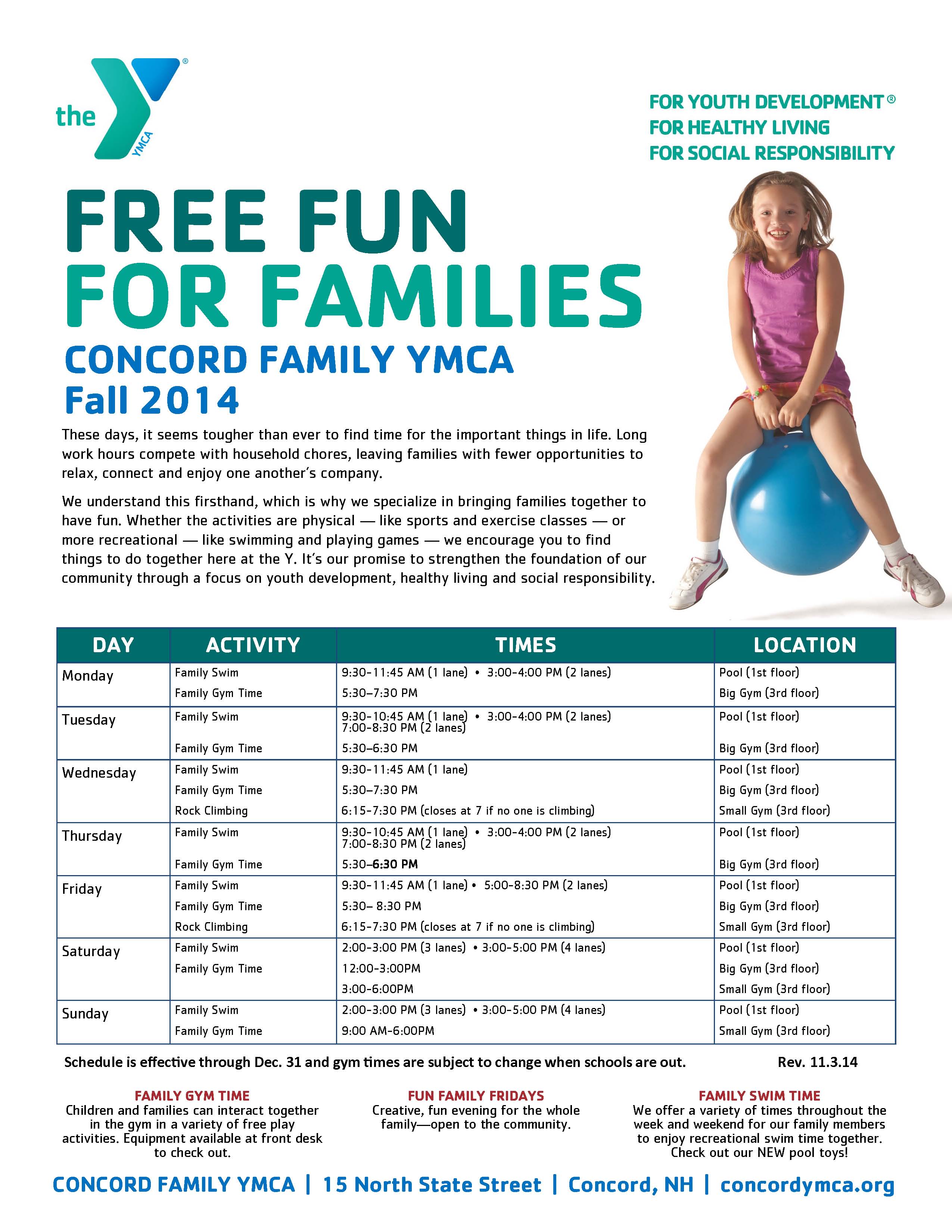 With the winter weather finally here, you and your kids might be feeling cooped up and stressed out. Well have no fear, the Y is here! Family time at the Y is about giving families the opportunities to deepen relationships, develop new skills and interests, improve their health and well-being, and connect to the community. The Concord Family YMCA has plenty of activities for kids and their parents to let off steam, get active and spend time together, whether it’s Family Gym Time (have you tried our new gym toys?!) or Family Swim Time (we have new pool toys to play with too!), or our Fun Family Fridays. See our website, www.concordymca.org, or the enclosed flyer, for more details.