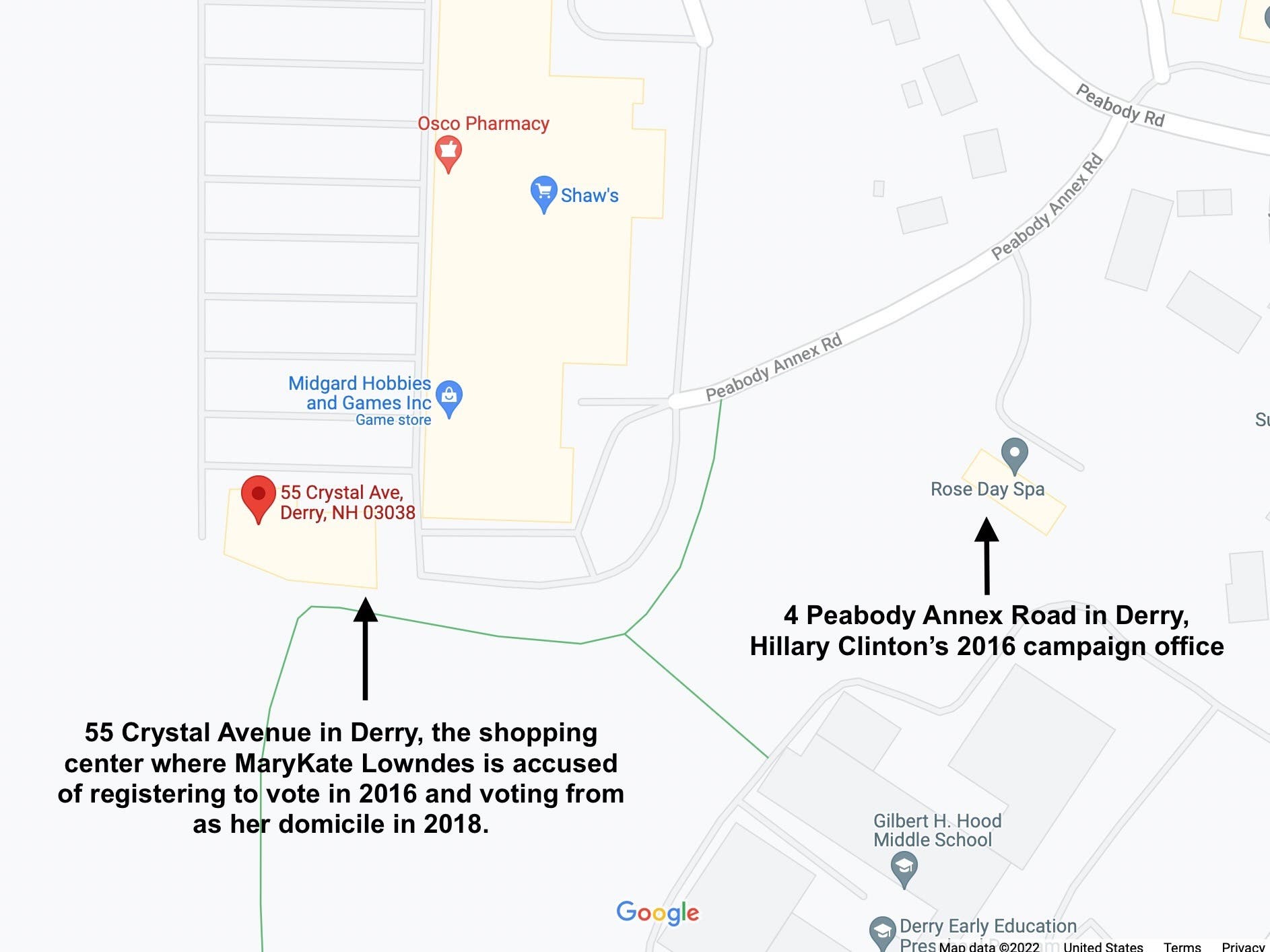 This map shows the shopping center where MaryKate Lowndes is accused of registering to vote in 2016 and voting from as her domicile in 2018. The address was mere feet from the Hillary Clinton for President office in 2016. Credit: Google maps