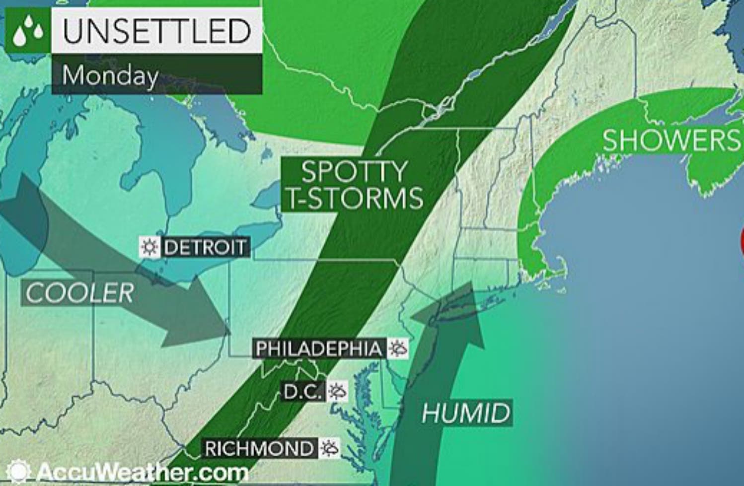 AccuWeather.com is warning that showers and thunderstorms now hitting the Midwest will be in the region by Monday night and into Tuesday. Expect it to be humid at times, with patchy fog in the early morning hours. The sun will return on Wednesday and the weather should be good during the latter part of the week and into the weekend, according to meteorologists.