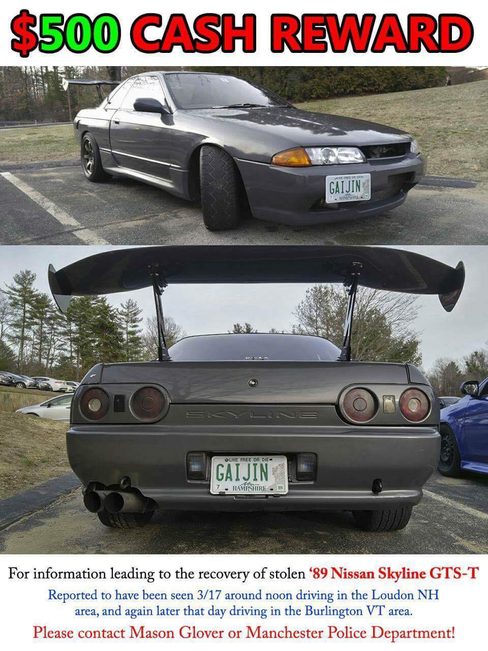 MANCHESTER, NH - A $ 500 reward is being officer for information leading to the recovery of this stolen $1989 Nissan Skyline GTS-T.
