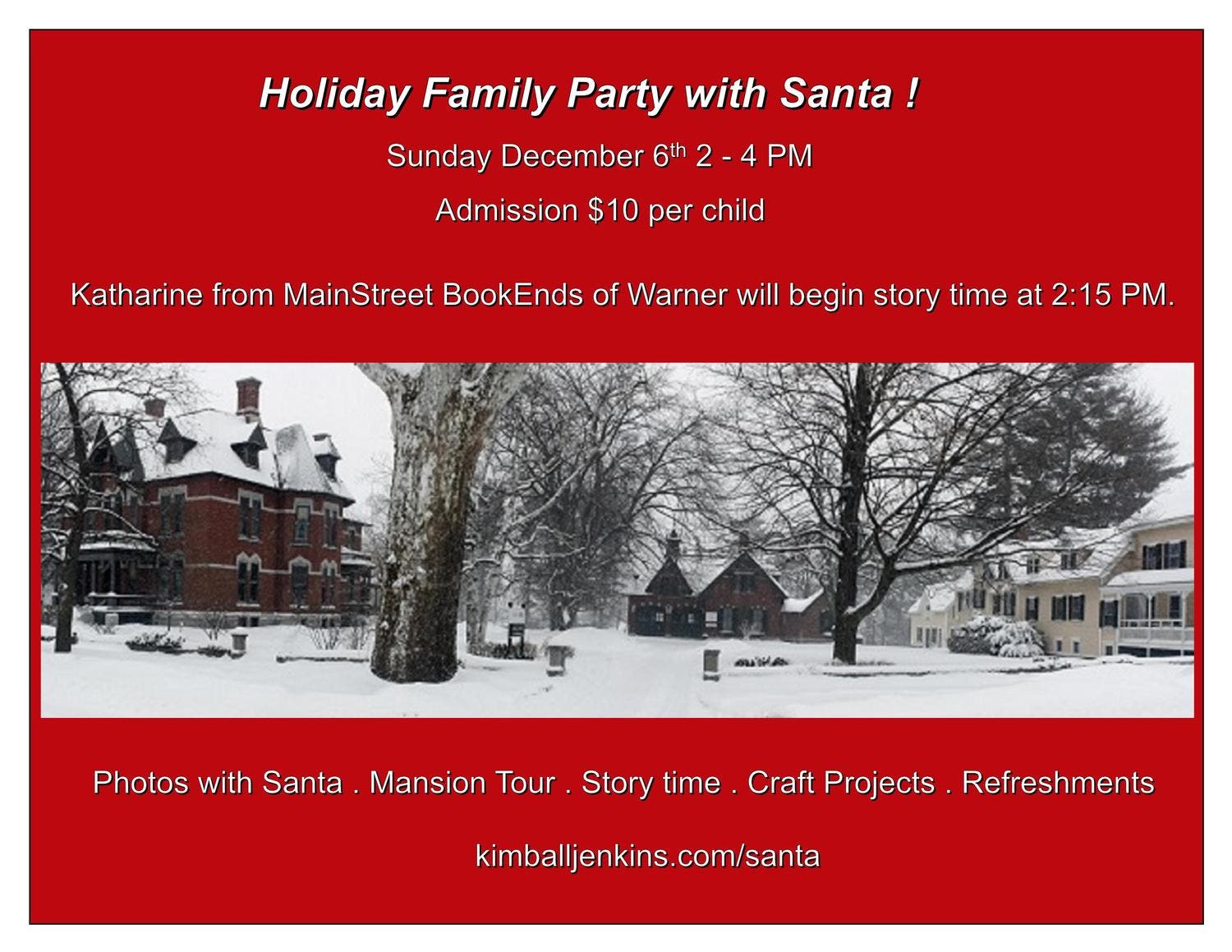 The 1st Annual Holiday Family Party with Santa will be held on from 2 to 4 p.m. on Sunday, Dec. 6, 2015, at the Kimball Jenkins Estate in Concord. Admission is $10 per child.