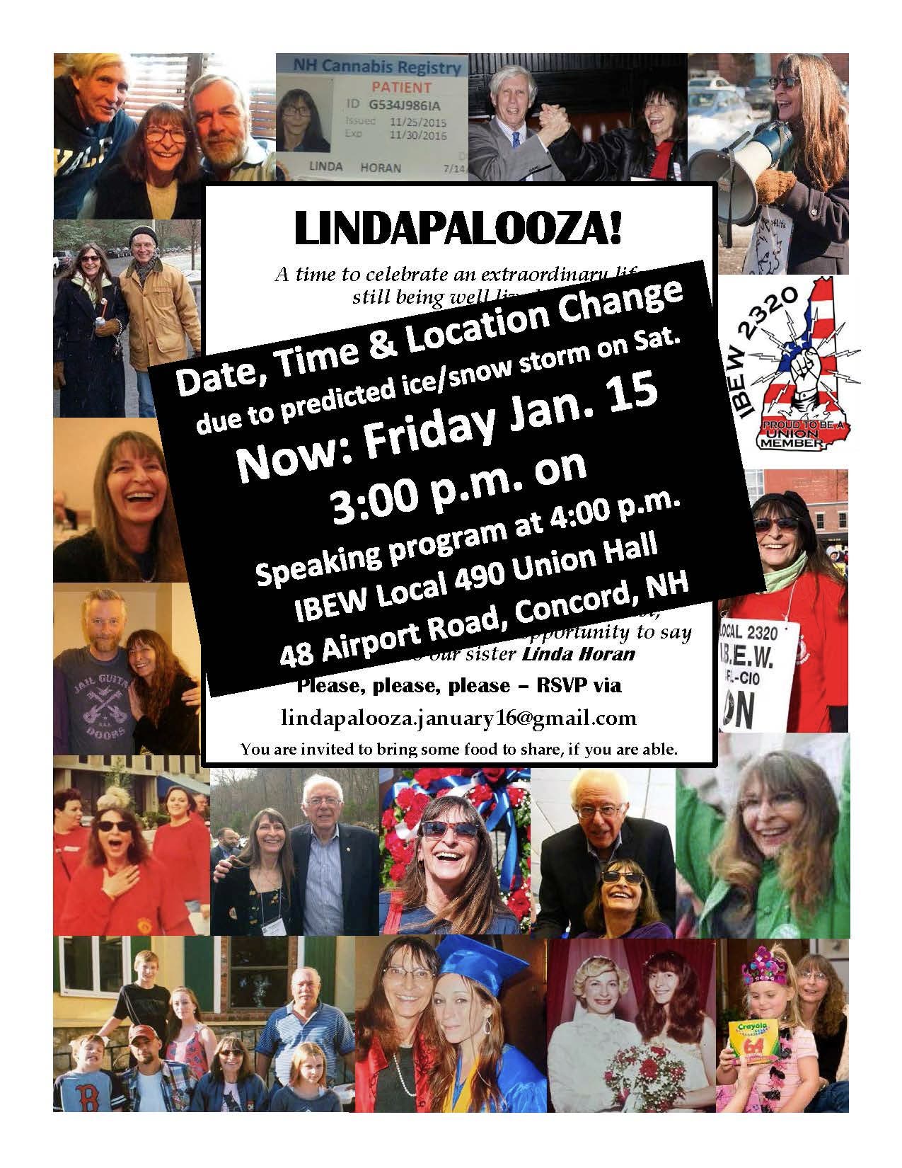 The event, dubbed “Lindapalooza,” will be held at 3 p.m. on Friday, Jan. 15, 2016, at the IBEW Local 490 Union Hall, 48 Airport Road in Concord.