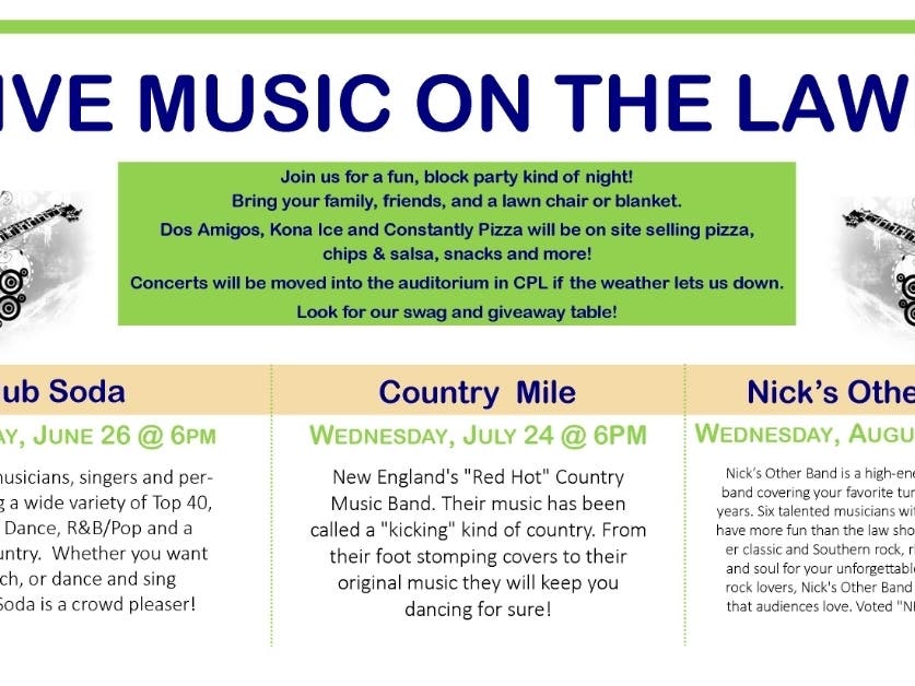 CONCORD – Live Music on the Lawn returns to the Concord Public Library for a fifth summer! Local favorite, Club Soda, will kick off the series on June 26th. On July 24th, Country Mile, New England’s “Red Hot” country band will perform “foot stomping covers and originals” that are sure to get the crowd dancing. And, on August 21st, Nick’s Other Band returns by popular demand! All shows are on Wednesday evenings and start at 6:00pm.