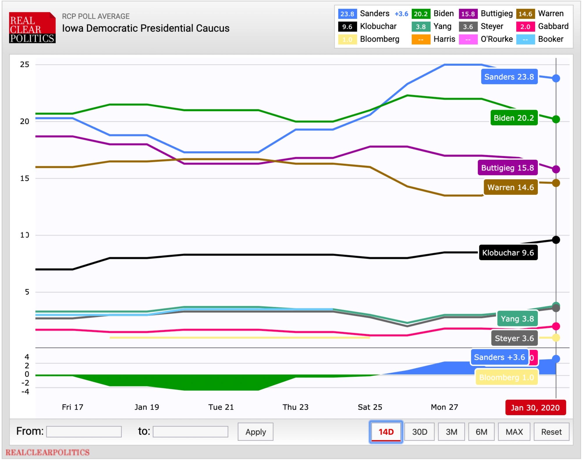 A screenshot of the RealClearPolitics.com average for the last two weeks of polling in Iowa.