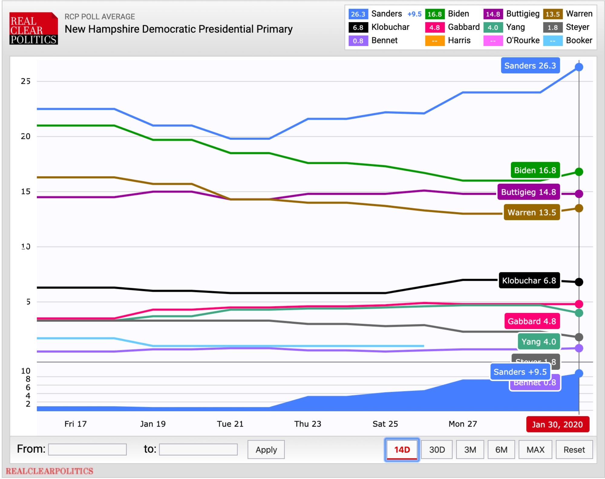 A screenshot of the RealClearPolitics.com average for the last two weeks of polling in New Hampshire.