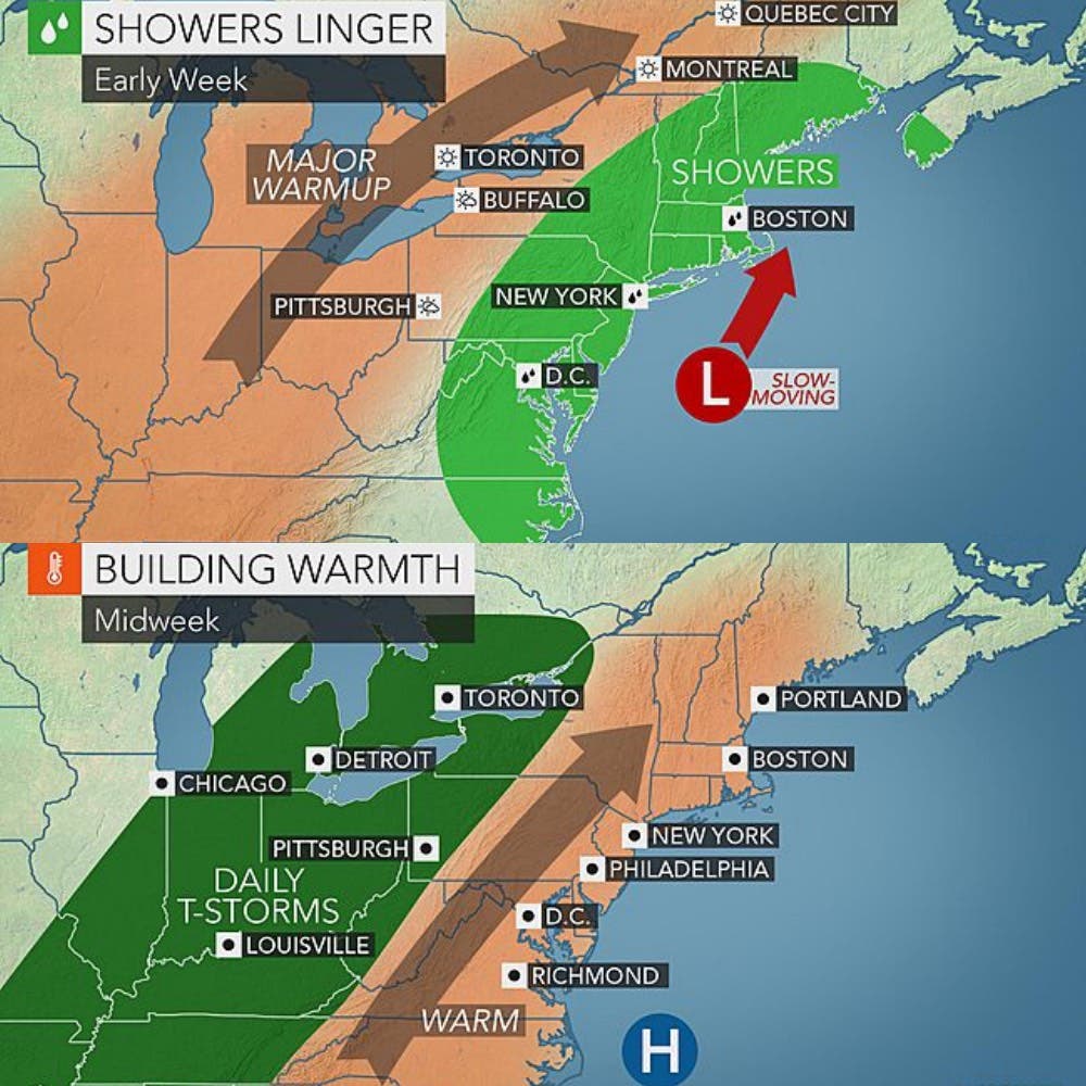 Tuesday: A chance of showers in the afternoon and then, a possibly thunderstorm by mid-afternoon, and then showers in the late afternoon, with clouds and temps in the upper 60s. During the evening, a slight chance of rain.