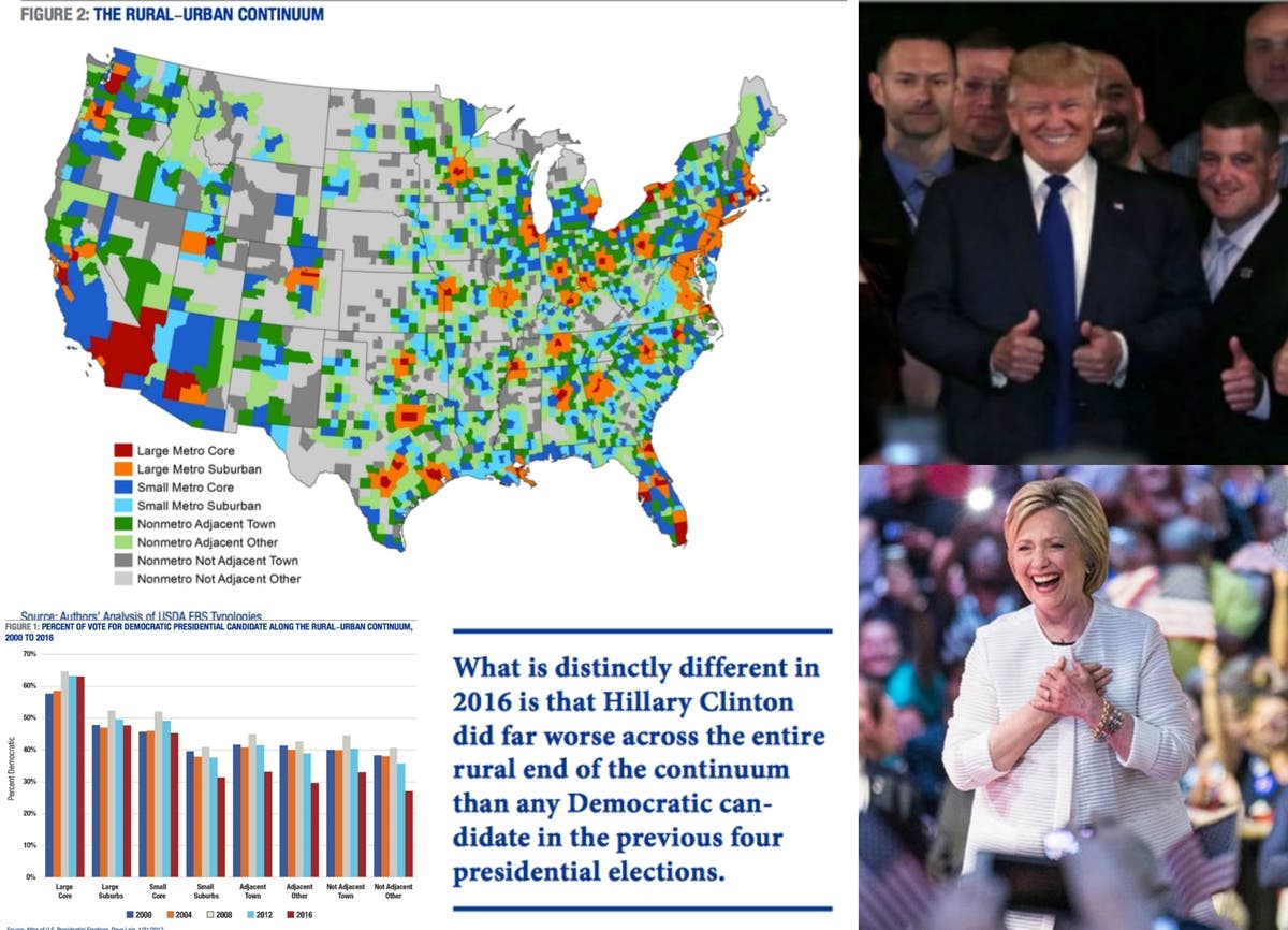 “Through the last five presidential elections voting patterns were consistent along a rural-urban continuum,” the researchers reported. “Democrats did best at the urban end of the continuum and Republicans at the rural end. What is distinctly different in 2016 is that Hillary Clinton did far worse across the entire rural end of the continuum than any Democratic candidate in the previous four presidential elections.”