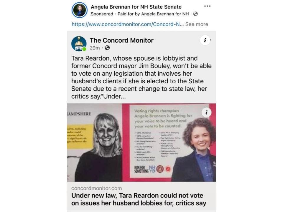 A photo of an ad on the author’s Facebook feed, paid for by Angela Brennan, featured a darkened photo of one of her two opponents, Tara Reardon. Credit: Tony Schinella