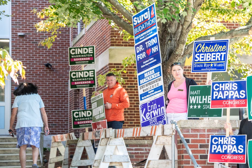 At the Ward 1 polls in Manchester on Tuesday afternoon, state Sen. Keith Murphy, a Republican, left, and state Rep. Christine Seibert, a Democrat, left, stand outside. When the photo was taken, Republican candidates Kelly Ayotte and Chuck Morse had no signs or presence at the polls. Credit: Jeffrey Hastings