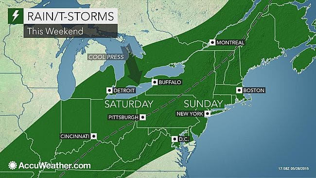 AccuWeather.com forecasters are reporting that rain and thunderstorms are possible across the weekend with a bit of a cool down on Sunday.