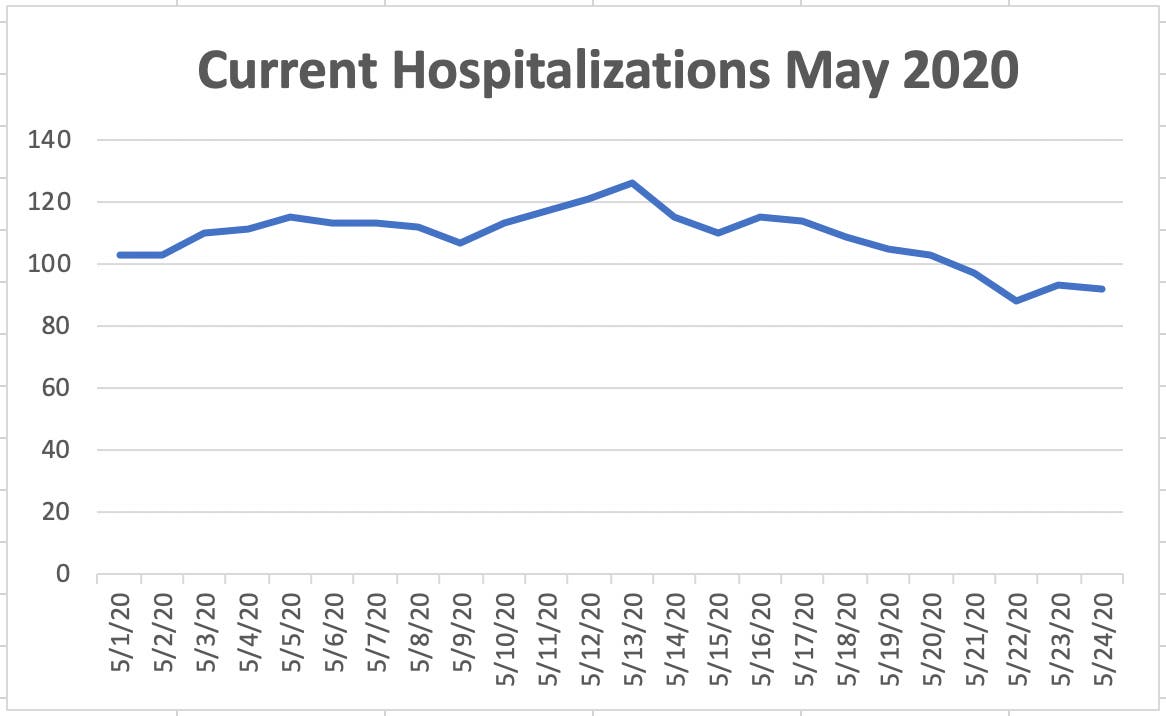 None of the new infections reported Sunday have been hospitalized bringing current hospitalizations at 92 patients. Current hospitalizations have been been on a downward trend since they peaked on May 13 at 126.