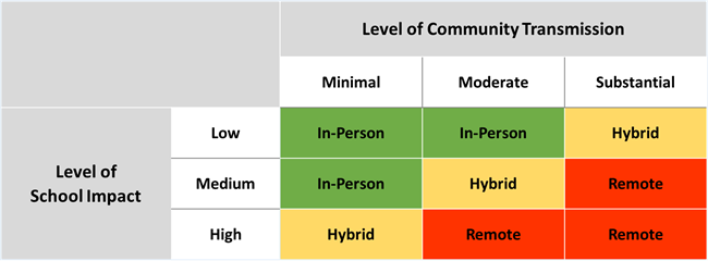 Public health officials are using this matrix as a guide for when schools should shift from various forms of learning. Credit: New Hampshire Department of Health and Human Services.