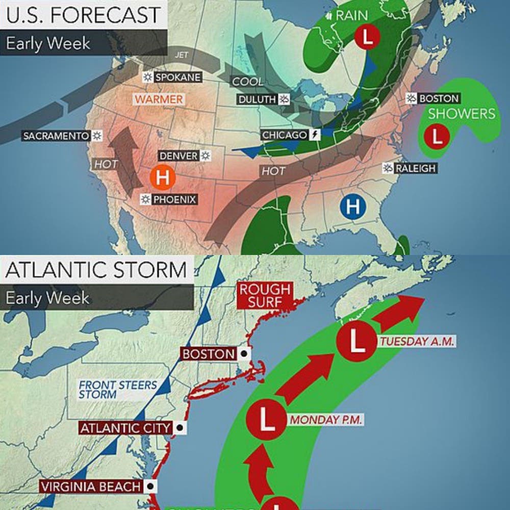 AccuWeather.com though is warning that if you’re heading to the beach on Monday afternoon or Tuesday morning, beware of an off-the-coast system that could bring some storm surges to the coast. If you're heading out into the ocean, expect winds of up to 40 to 50 mph with seas that will be more treacherous than normal.