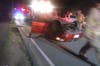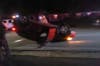 A car flipped over on its side and landed in the middle of the road striking at least two other vehicles in the process. At least one person, the driver of the flipped car, was reportedly transported to the hospital.