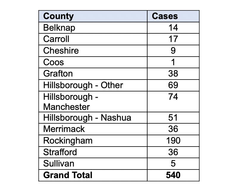 Update: Officials report 61 new positive coronavirus cases, 20 are from Rockingham County, with 540 testing positive in New Hampshire.