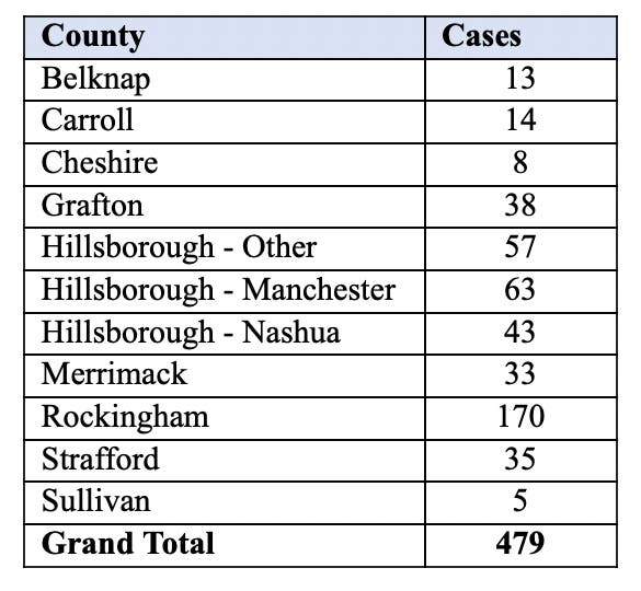 Of the new cases, most, 44, reside in Hillsborough County, Manchester, and Nashua. Another 17 live in Rockingham County and four in Merrimack County.