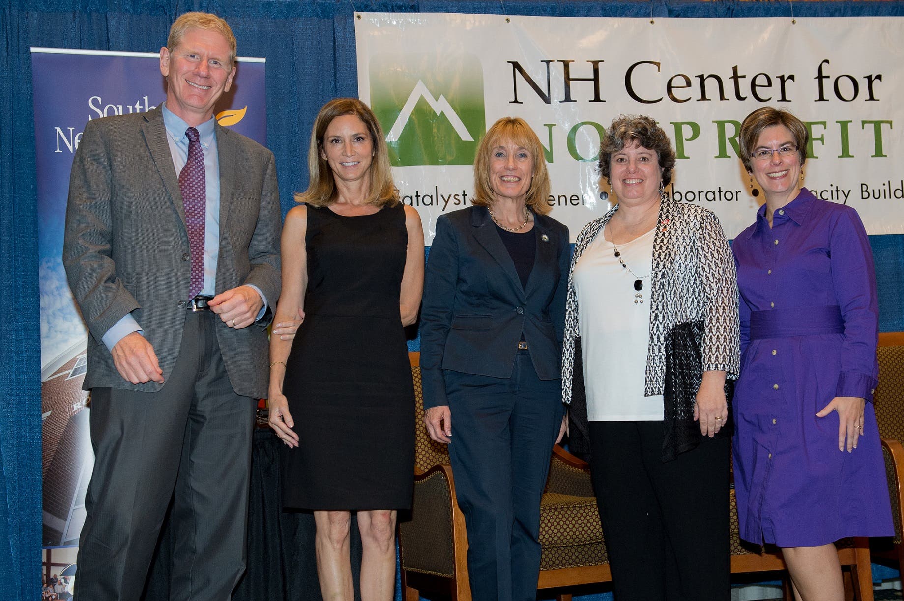 Caption: Pictured from left to right, Richard Ober, president and CEO of the New Hampshire Charitable Foundation; Marti Ilg, executive director of Lakes Region Child Care Services; Gov. Maggie Hassan; Keryn Bernard-Kriegl, executive director of New Hampshire Children’s Trust; and Jeanine Tousignant, board vice-president of the NH Center for Nonprofits. The Excellence in Nonprofit Management Award was presented during the Nonprofit Leadership Summit at the Grappone Conference Center in September. Awards were hand-made by Susanna Ries of Mount Vernon, N.H.