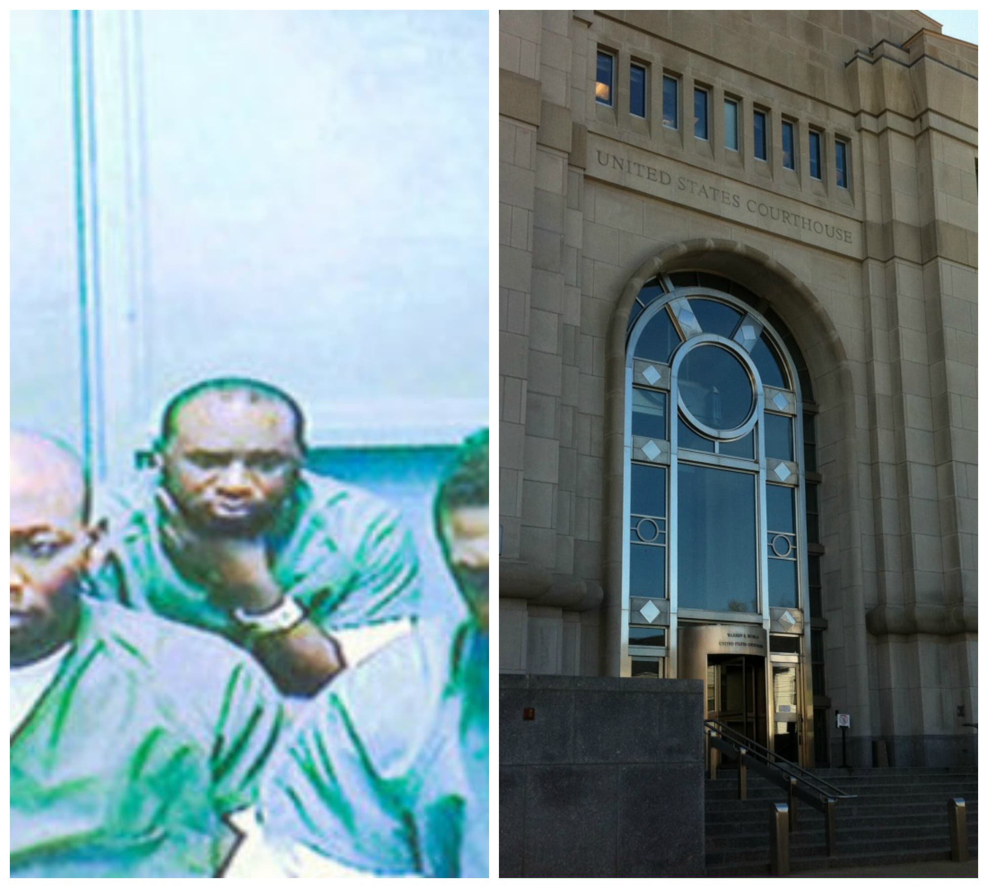 Caption: A file photo of Oluwaseun Adekoya, left, from NJ.com, after a fraud arrest in 2013. At right, the Rudman federal courthouse in Concord. Credit: Tony Schinella.